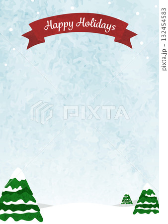 水彩のもみの木と雪の冬景色 クリスマスイラスト ハッピーホリデー