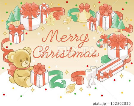 クリスマス プレゼント 飾り 手描き 水彩 フレーム あしらい かわいい 背景 イラスト素材
