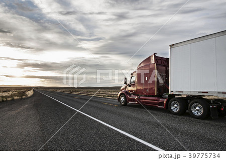 Commercial truck on the road at sunset in eastern Washington, USA