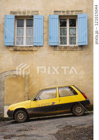 Yellow postal delivery vehicle parked outside a townhouse