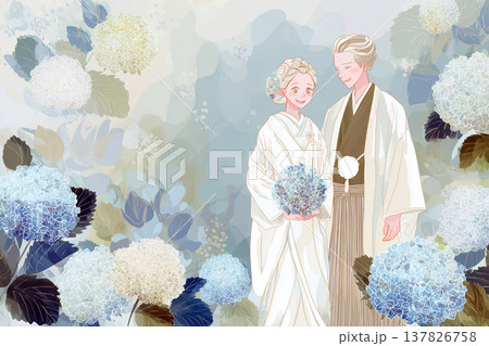 アジサイの花に囲まれて幸せそうに微笑む水彩画風の優しいタッチで描かれた和装の結婚式のカップル