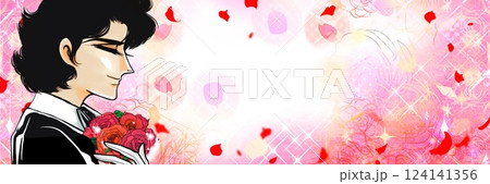 微笑む黒髪パーマイケメン男性が薔薇のブーケを手に持って求婚する昭和少女漫画風イラストと薔薇の花園背景