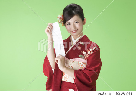 おみくじを持つ振袖姿の若い女性