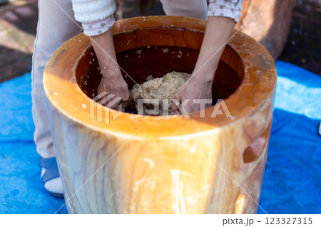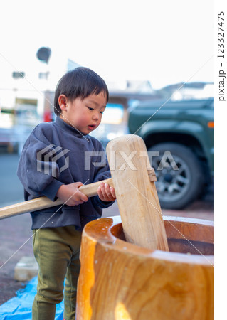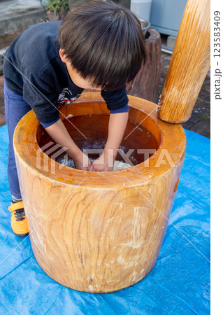 餅つきをする親子 杵と臼で餅をつく人 餅をつく子どもと大人 イメージ素材