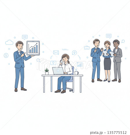仕事中のビジネスパーソン詰め合わせ(グラフ・電話・チーム)