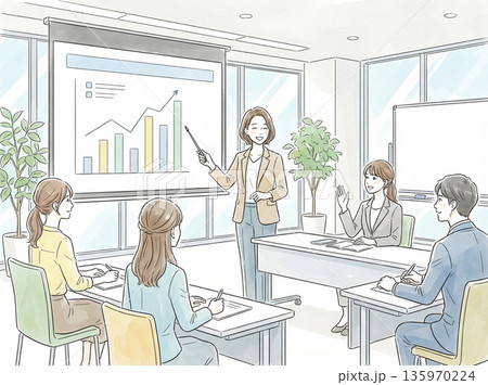 さまざまなビジネスシーンのシチュエーションのイラスト、プレゼンや会話をしているオフィスレディーたち