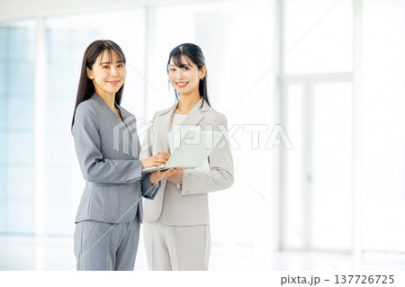 オフィスで打ち合わせをするスーツ姿の女性2人のビジネスパーソンのシンプルな線画ベクターイラスト