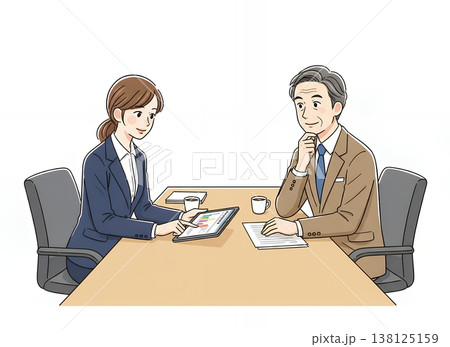 オフィスで打ち合わせをするスーツ姿の男性2人のビジネスパーソンのシンプルな線画ベクターイラスト