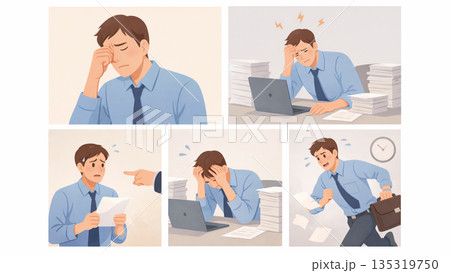 仕事で悩む会社員の男性セット問題・不安・行き詰まりを表すビジネスイラスト(AI制作)