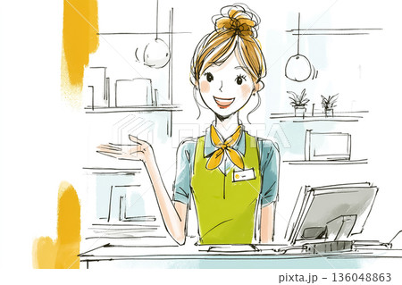 受付カウンターで来客を迎える女性|案内・接客のイメージ