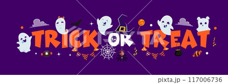 イラスト素材: Trick or treat Halloween banner with kawaii ghosts, holiday pennant flags and candies. Cute white ghosts vector characters with cartoon Halloween pumpkin, zombie lollipops and witch finger cookies