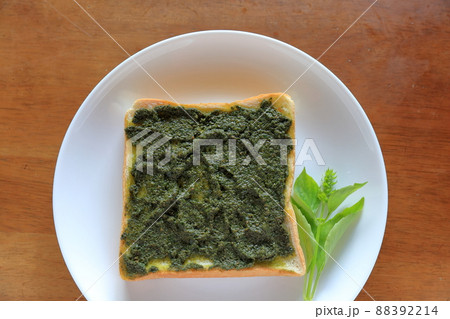 写真素材: 香ばしいバジルのトースト焼きと葉(バジルペースト、食パン)