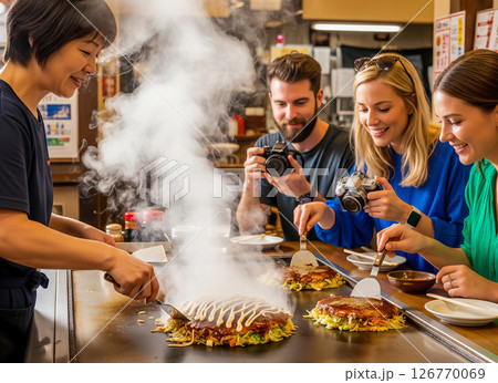 湯気立つ鉄板で広島お好み焼きを楽しむ外国人観光客