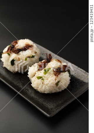 ホタルイカとわかめのおにぎり 黒背景