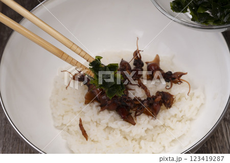 ホタルイカとわかめのおにぎりを作る工程
