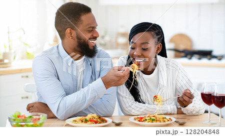 Beautiful african american couple having romantic lunch together in kitchen, cheerful black spouses eating spaghetti and drinking wine, having fun at home, loving man feeding his wife, copy space