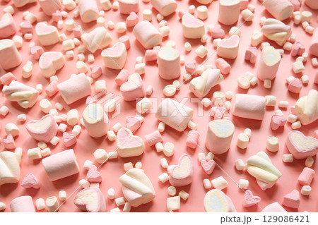 Confectionery and sweeties varieties background: light pink and white marshmallows, sugar confetti, bonbon and candies, selective focus