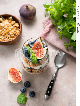 Delicious natural yogurt with muesli, figs and berries in a glass on a pink background with mint.