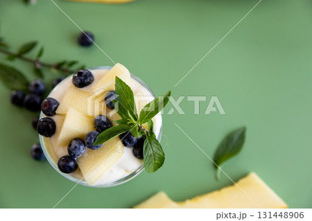 Healthy breakfast yogurt melon blueberries and mint leaf