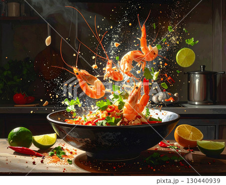 AI generated image of fresh shrimp kaeng liang ingredients bursting from a bowl in a modern kitchen with low light and vibrant motion showing freshness and Thai flavor