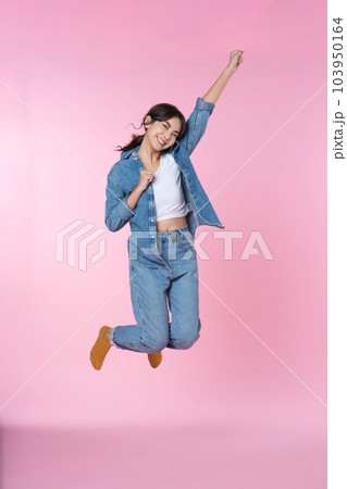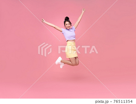 Young Asian woman raises her arm and jumping in a studio shot, expressing happiness and success isolated pink background