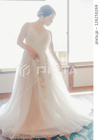 ウェディングドレスに身を包む女性|結婚準備のワンシーン