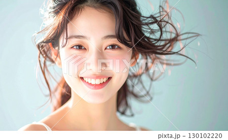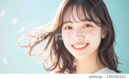 風を感じながら笑顔を見せるナチュラルな若い女性