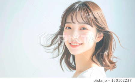 柔らかな風に髪が揺れるスタジオで微笑む若い女性