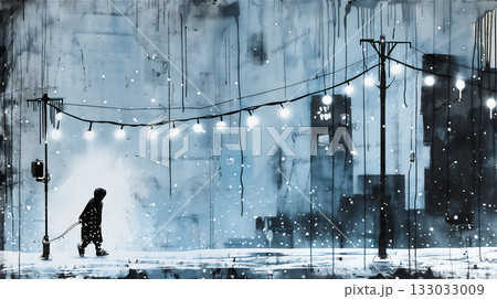 雪の中を歩く子供と街の風景