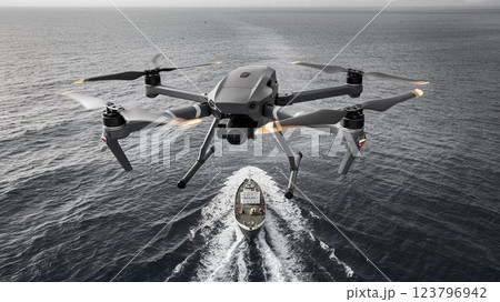 【16:9版】ドローン画像 海上で船の位置を確認するドローン 4本アーム 白 黒 グレー