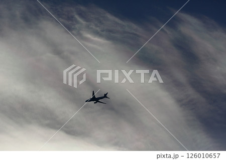 虹色の雲と飛行機シルエット