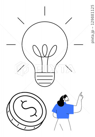Large light bulb radiating light, dollar coin and woman pointing toward bulb. Ideal for innovation, finance, creativity, entrepreneurship, business strategies, motivation vision. Line metaphor