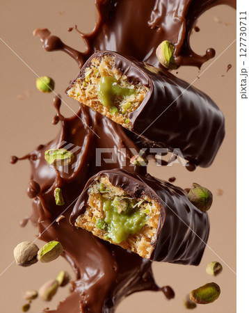 Dubai Chocolate Pistachio Bars with Kataifi Dough. Broken in half with rich, glossy melted chocolate coating and a golden crispy texture underneath, luxury food advertising style. AI Generative