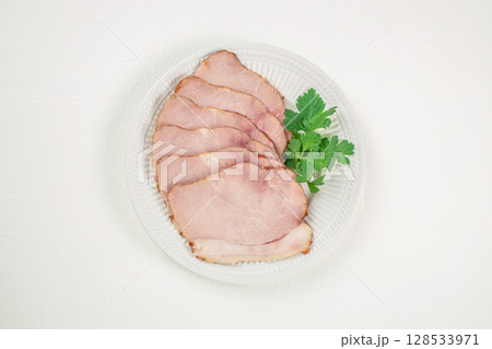 Thin slices of roasted pork loin are neatly arranged on a white plate and garnished with a sprig of fresh parsley for a clean and appetizing presentation