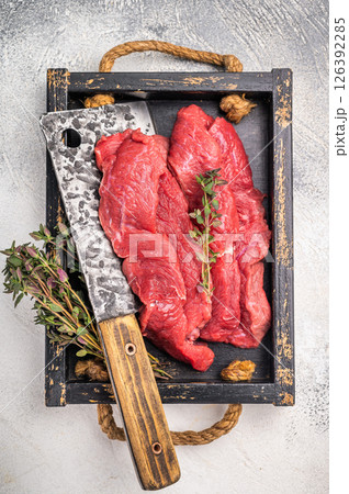 Exquisite beef shoulder tender, denver steak waiting to be transformed into a gourmet dish. Ideal for grilling or roasting for an unforgettable dinner. grey background. top view