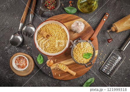 Raw ptitim pasta on a dark background. top view. copy space for text