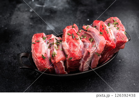 Raw Veal Short Ribs, fresh meat with thyme. black background. top view