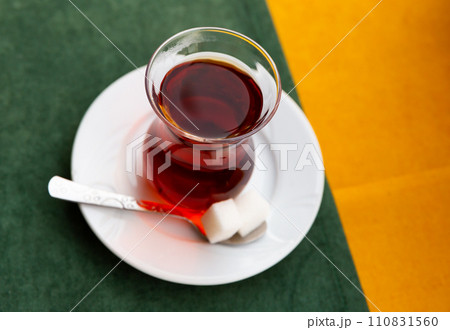 Close-up Of fresh hot Turkish tea with two sugar cubes