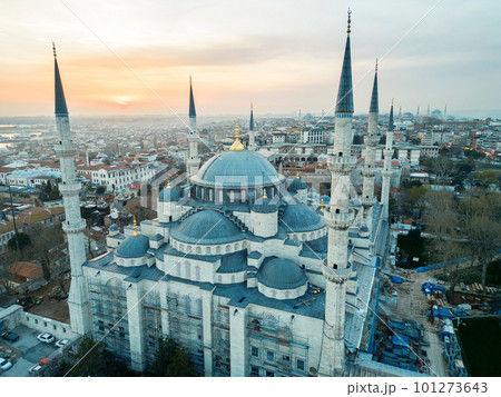 Aerial drone view of The Blue Mosque in Istanbul at sunset, Turkey