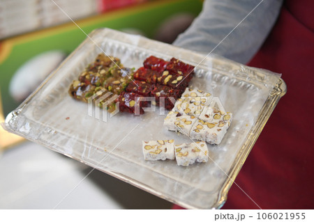 Traditional oriental sweet pastry cookies, nuts, dried fruits, pastilles, marmalade, Turkish desert with sugar, honey and pistachio, in display at a street food market