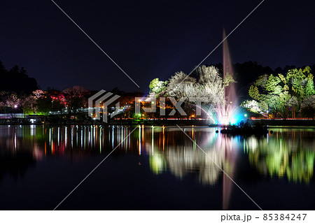 茨城県水戸市千波湖カラフルな噴水の夜景