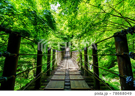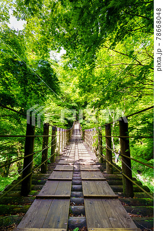 新緑の汐見滝吊り橋03 花貫渓谷 横構図