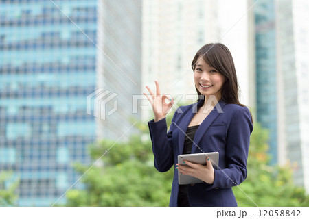Successful young Chinese business woman with tablet iPad in front of office building giving OK sign