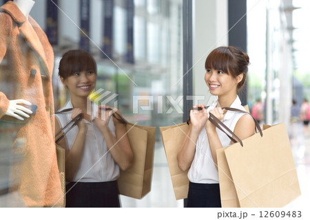 2 young chinese office lady with paper bags window shopping along mall promenade