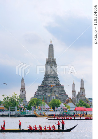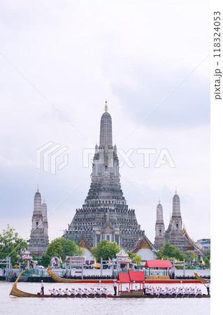 タイ・バンコクのワット・アルンとタイ王室御座船水上パレードのリハーサル