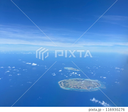 飛行機から見た風景。上空から日本・沖縄・離島の海・島・空。