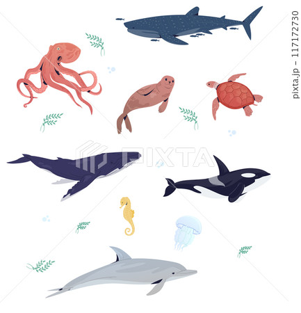 Underwster animals set with hand drawn sea life elements. Vector doodle cartoon set of marine life objects for your design.