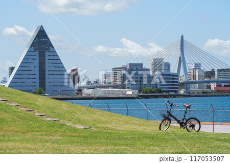 青森新中央埠頭から望むアスパムと青森ベイブリッジ