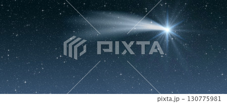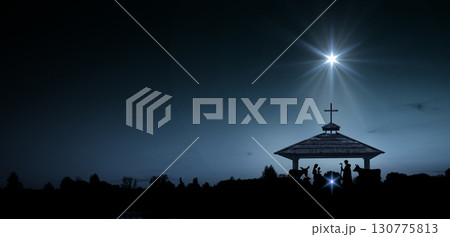 Bright Star of Bethlehem, or Christmas Star. Silhouettes of Jesus Christ, Mary, Joseph and animals. Starry sky at dawn