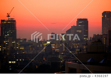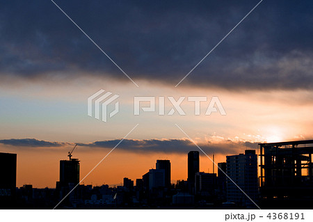 都会のあかね色の空とビルのシルエット